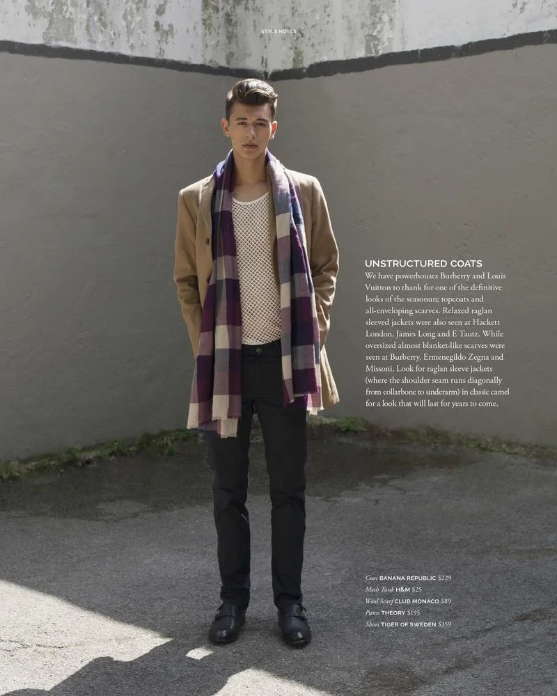 We have powerhouses Burberry and Louis Vuitton to thank for one of the definitive looks of the season...unstructured trenches,topcoats and all-enveloping scarves. Relaxed raglan sleeved jackets were also seen at Hackett London, James Long and E Tautz. While oversized almost blanket-like scarves were seen at Burberry, Ermenegildo Zegna and Missoni. Look for raglan sleeve jackets (where the shoulder seam runs diagonally from collarbone to underarm) in classic camel for a look that will last for years to come.