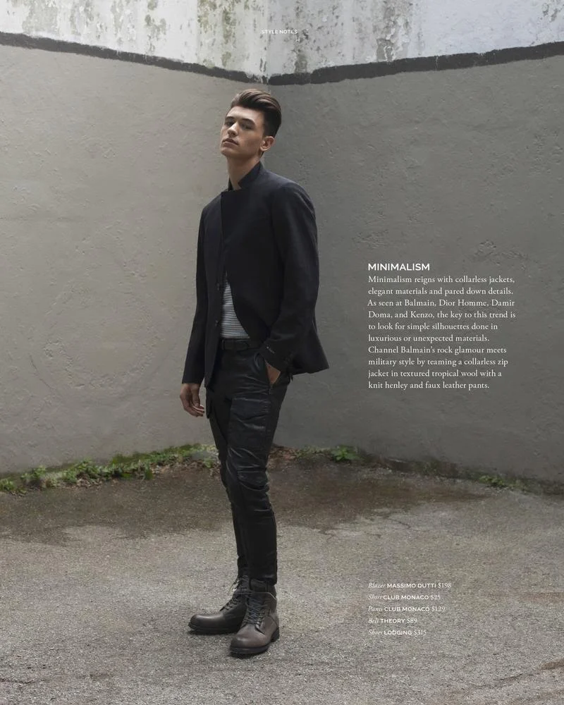 Minimalism reigns with collarless jackets, luxe materials and pared down details. As seen at Balmain, Dior Homme, Damir Doma, and Kenzo. The key to this trend is to look for simple silhouettes done in luxurious or unexpected materials. Channel Balmain’s rock glamour meets military style by teaming a collarless zip jacket in textured tropical wool with a knit henley and faux leather pants.